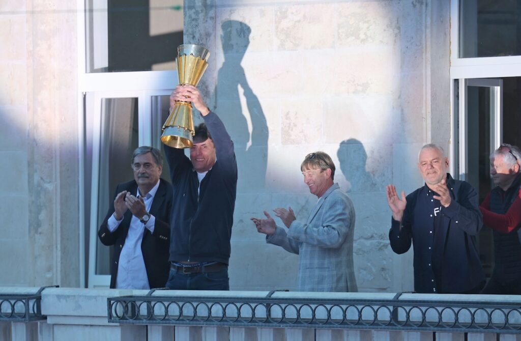 Vrhunac večeri dogodio se na balkonu gradske uprave, istom onom na kojem je prije 40 godina slavljen povijesni uspjeh. Gotovo cijela momčad popela se na balkon i podigla pehar, ponovivši trenutak koji je ušao u povijest. Posebno iznenađenje bilo je otkriće da je riječ o originalnom peharu, što ni sami igrači nisu znali do samog trenutka, budući da se u klupskim prostorijama čuva replika.