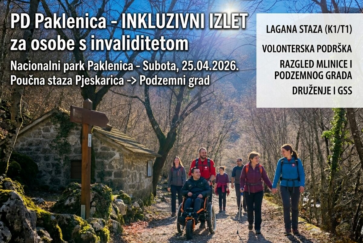 PD Paklenica organizira inkluzivni izlet za osobe s invaliditetom u Nacionalni park Paklenicu u petak, 25. travnja 2026. Izlet vodi poučnom stazom Pjeskarica do Podzemnog grada. Dio je nacionalnog projekta „Pruži mi ruku” – izleta za osobe s invaliditetom.