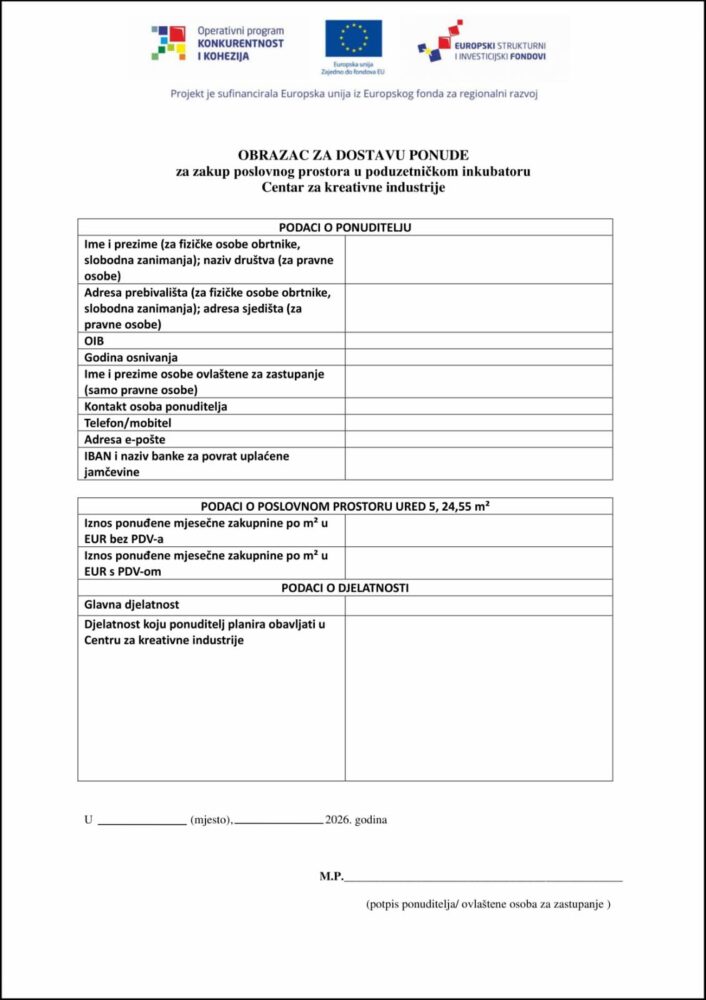 ZA PODNOŠENJE PONUDA ZA ZAKUP POSLOVNOG PROSTORA