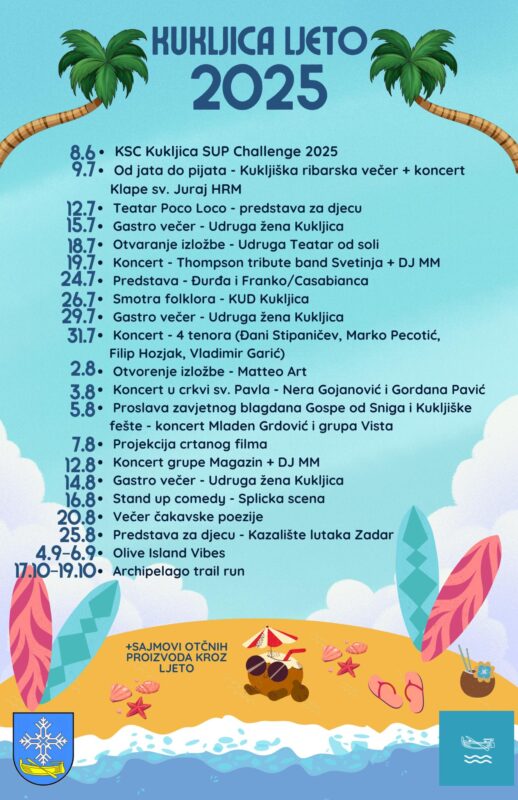 Turistička zajednica općine Kukljica s ponosom najavljuje „Kukljica Ljeto 2025.“, bogat i raznolik kulturno-zabavni program koji će se održavati tijekom cijeloga ljeta, od lipnja do listopada. Naše malo mjesto na otoku Ugljanu i ove godine postaje pozornica brojnih događanja – od koncerata i predstava, preko gastronomskih večeri, do sportskih i kulturnih manifestacija.