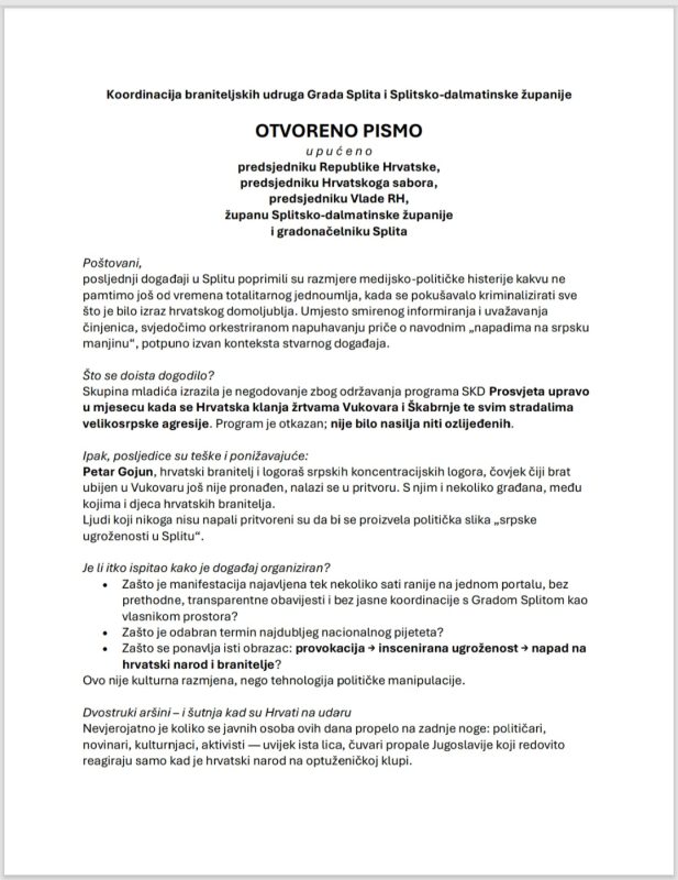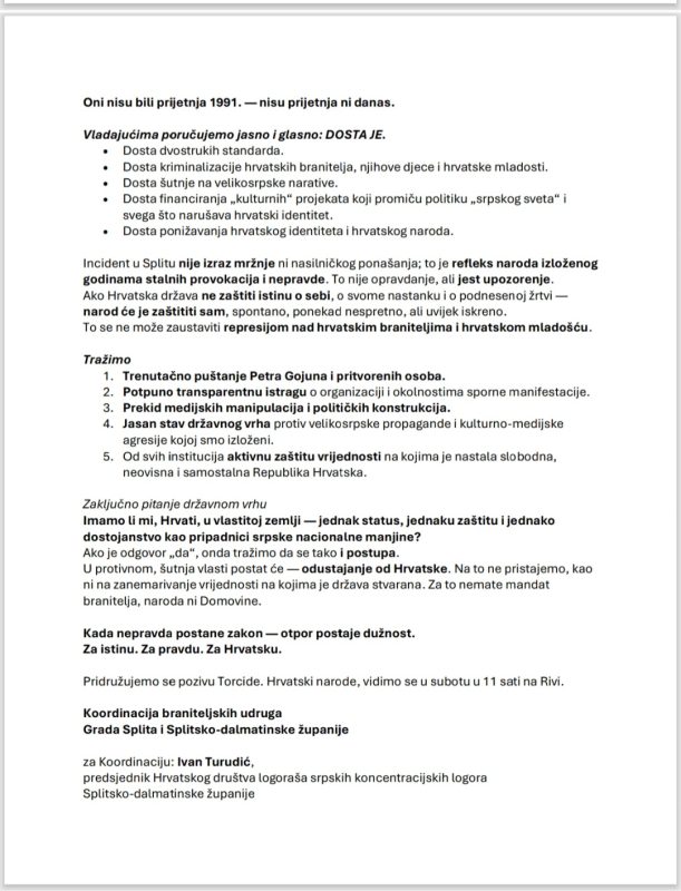 “Koordinacija braniteljskih udruga grada Zadra i Zadarske županije ovim putem izražava potporu Koordinaciji braniteljskih udruga Grada Splita i Splitsko-dalmatinske županije te podržava Otvoreno pismo upućeno predsjedniku, premijeru, Saboru!