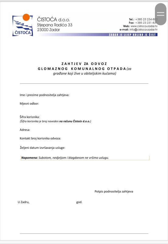 Može se poslati i poštom na adresu Stjepana Radića 33.  Također, odvoz se može naručiti i telefonom na broj 023 234 812.
