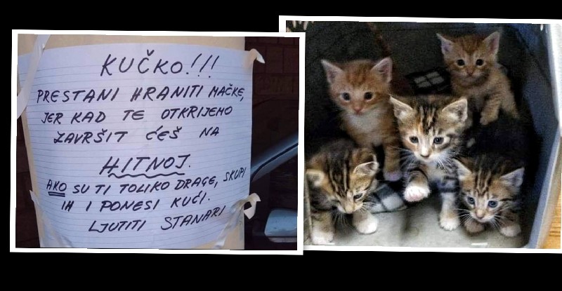 Jedna naša sugrađanka, stanovnica Poluotoka, doživjela je strašne uvrede i prijetnje stanara svog kvarta jer se smilovala i nahranila pet mačića i njihovu mamu, macu lutalicu.